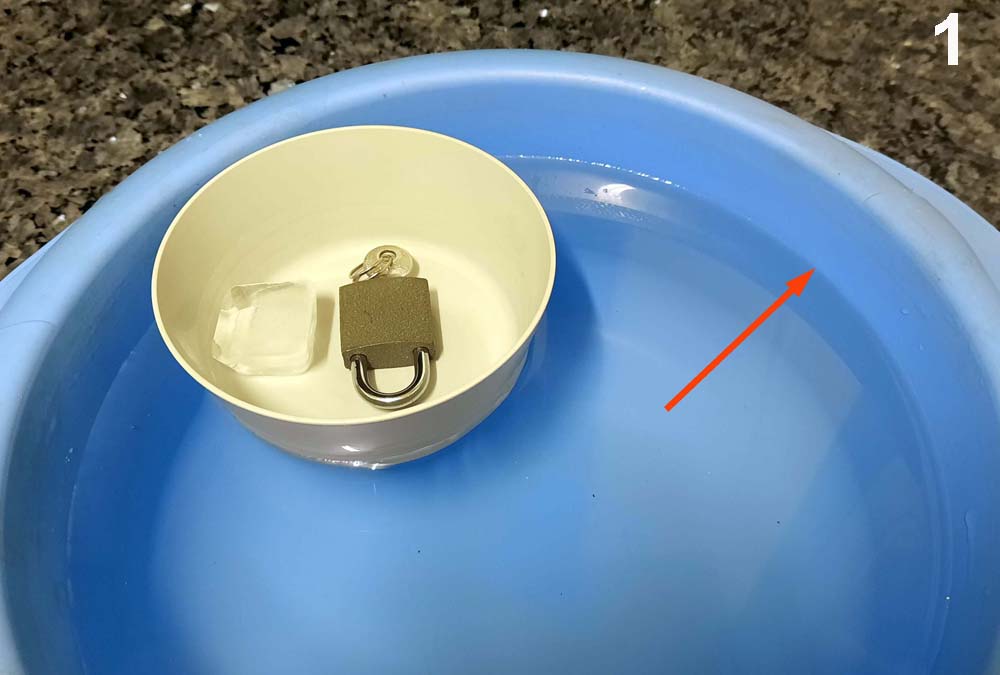 Sobre la superficie del agua del recipiente azul, flota un vaso que contiene un candado y un cubito de hielo. En esta condición, el nivel del agua es el que marca la flecha (1).