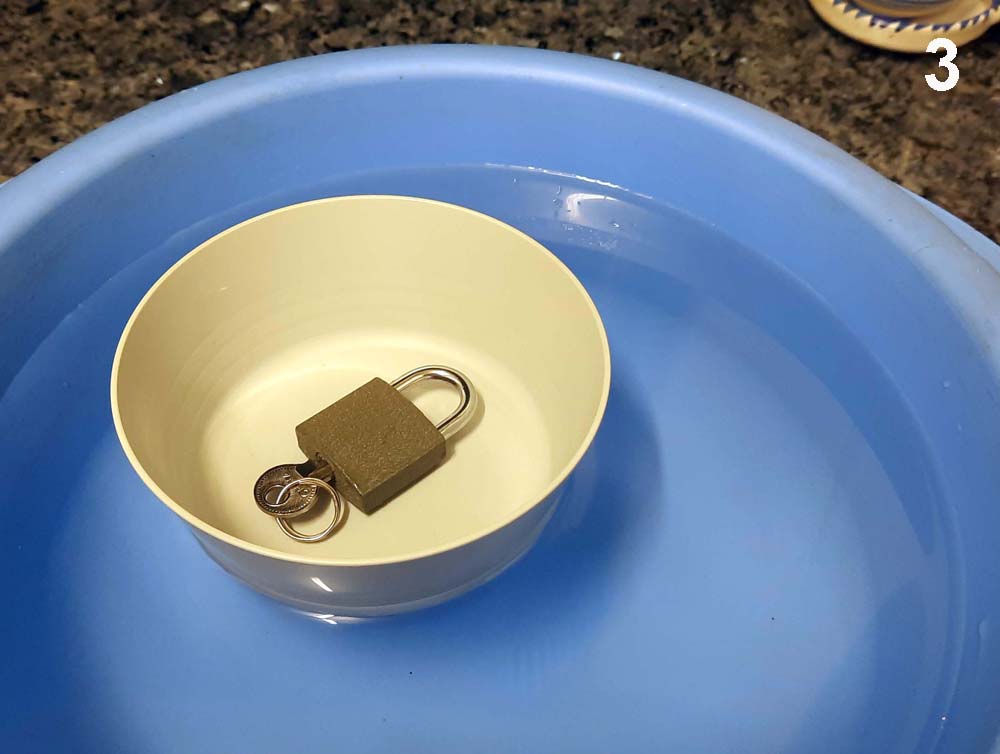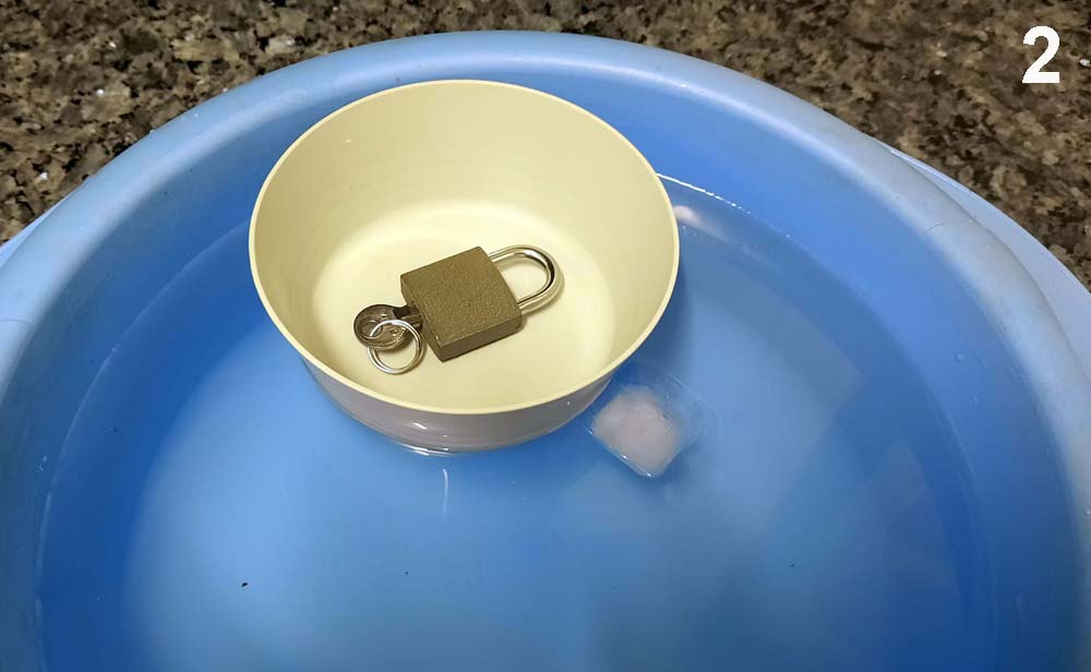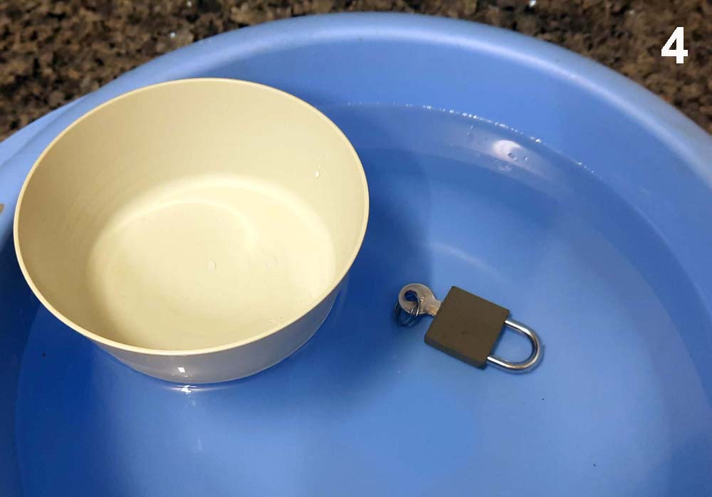 - Finalmente, también se tira al agua el candado ¿sube o baja el nivel del agua que contiene el recipiente azul?